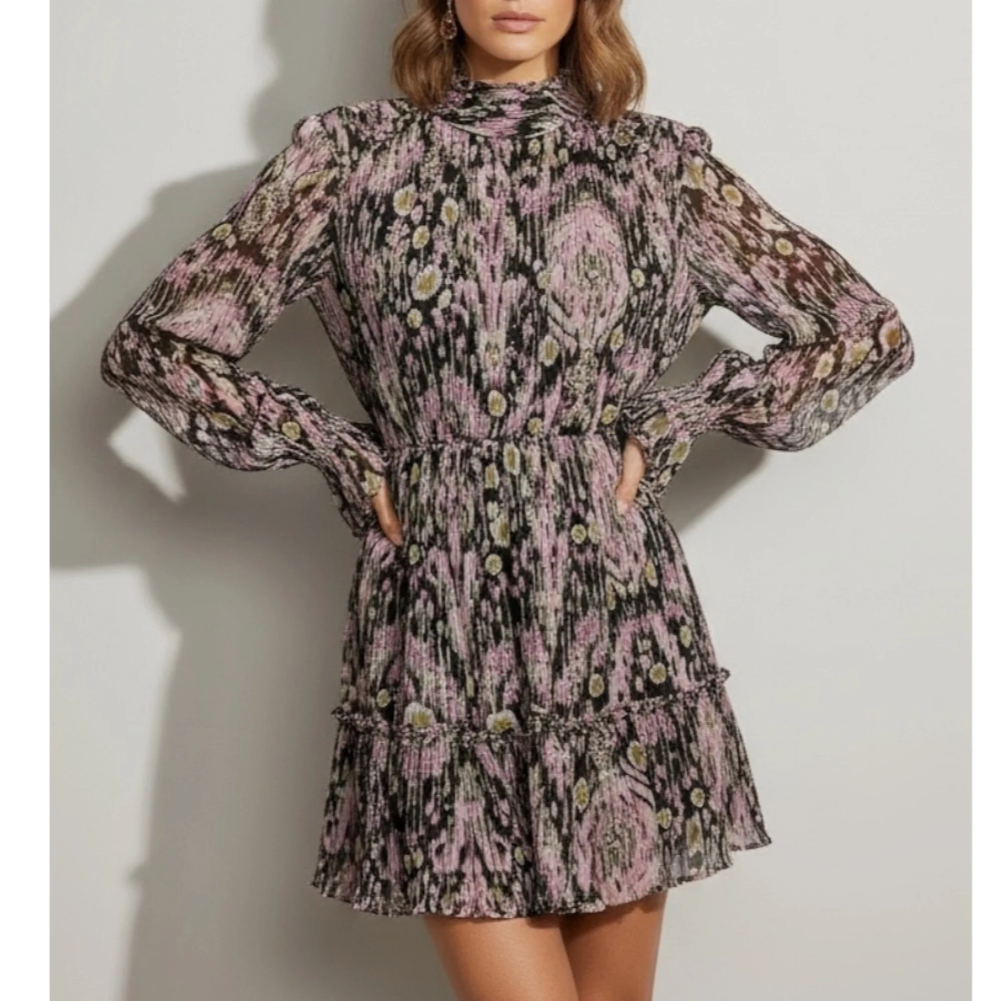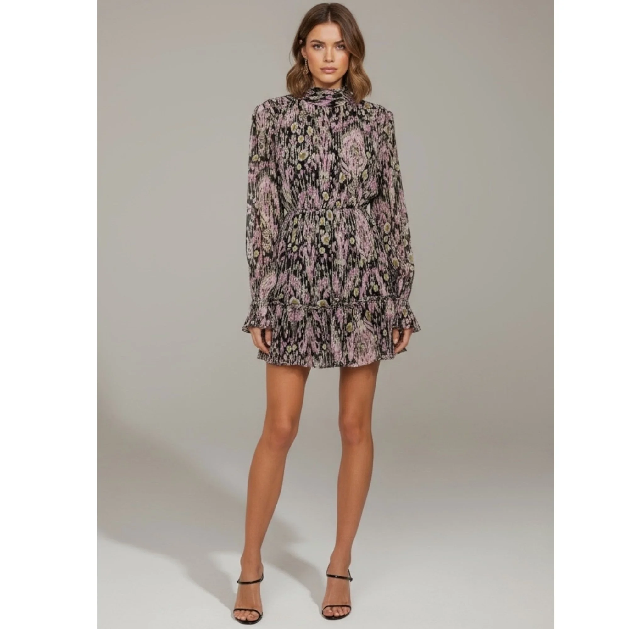 SABINA MUSAYEV Hermione Long Sleeve Pleated Lame Mini Dress, Black, Large