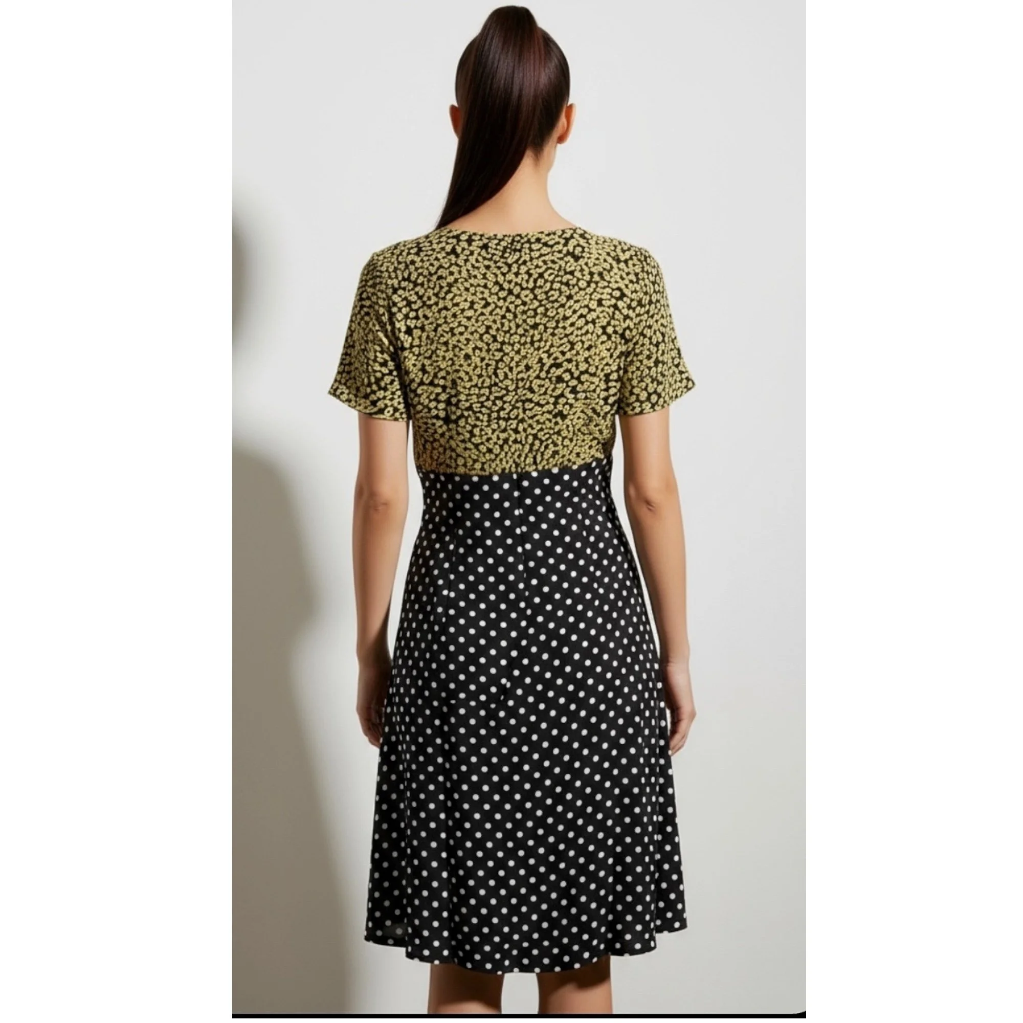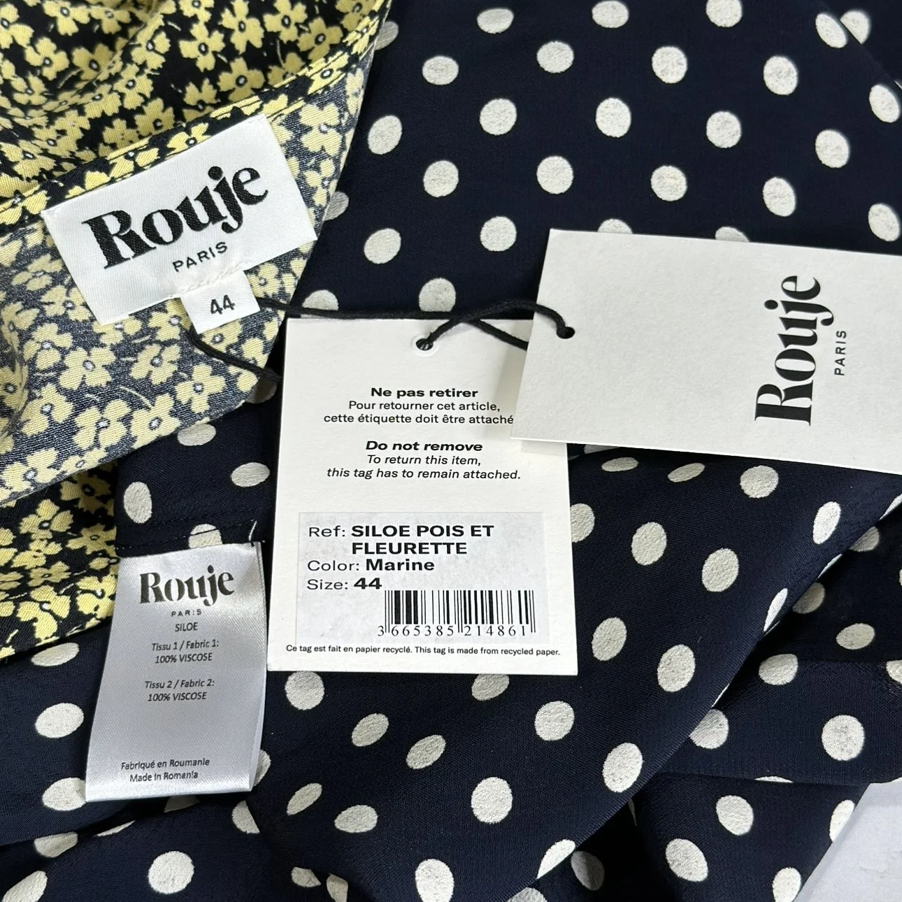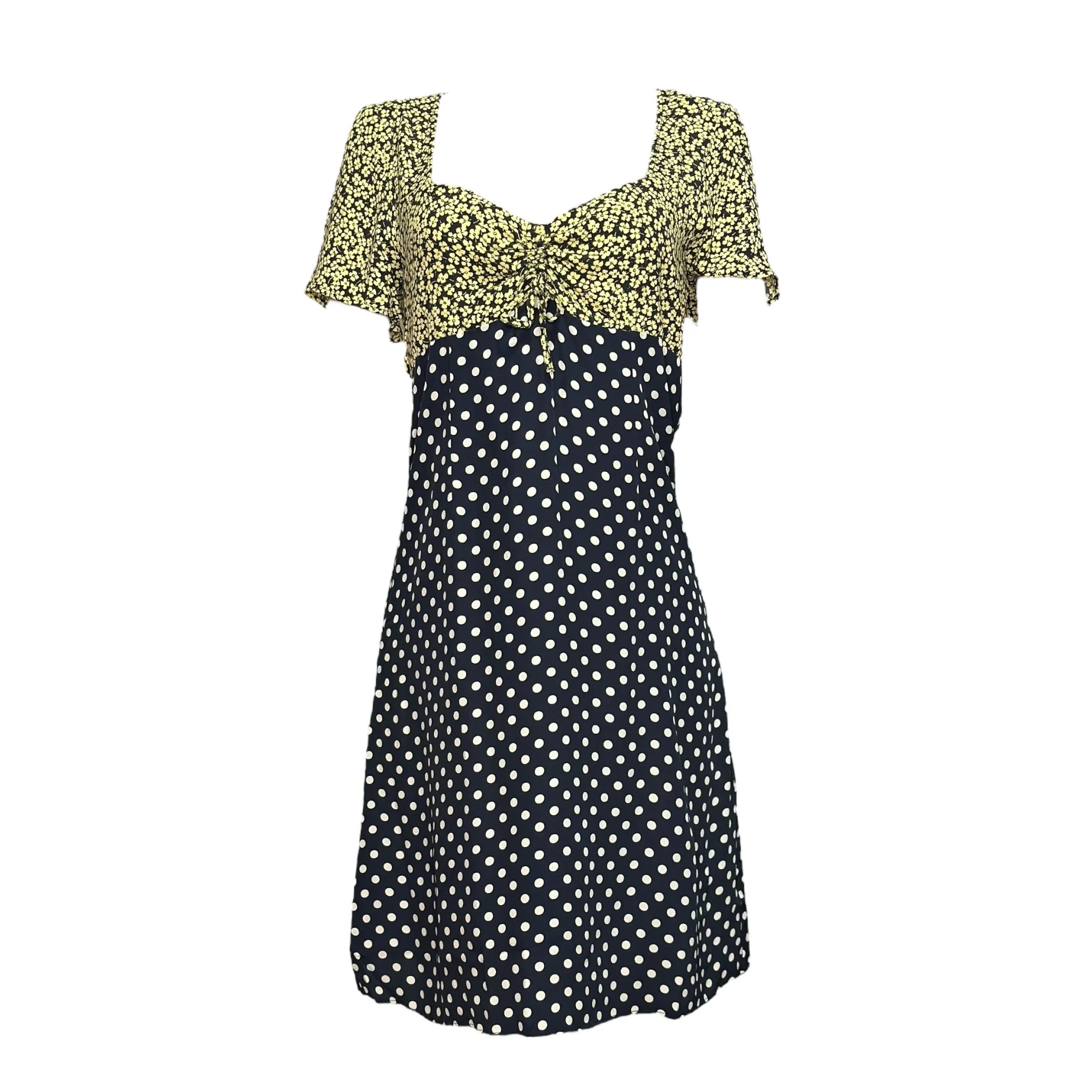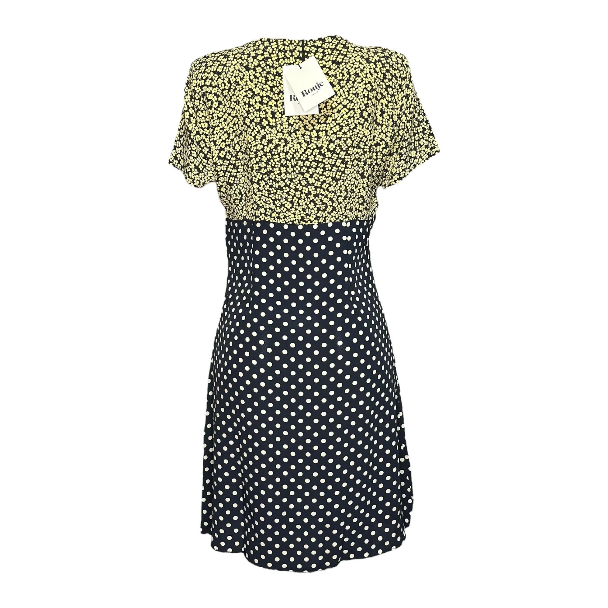 ROUJE PARIS Siloe Dress, Navy Polka Dot Yellow Floral, FR44/US12
