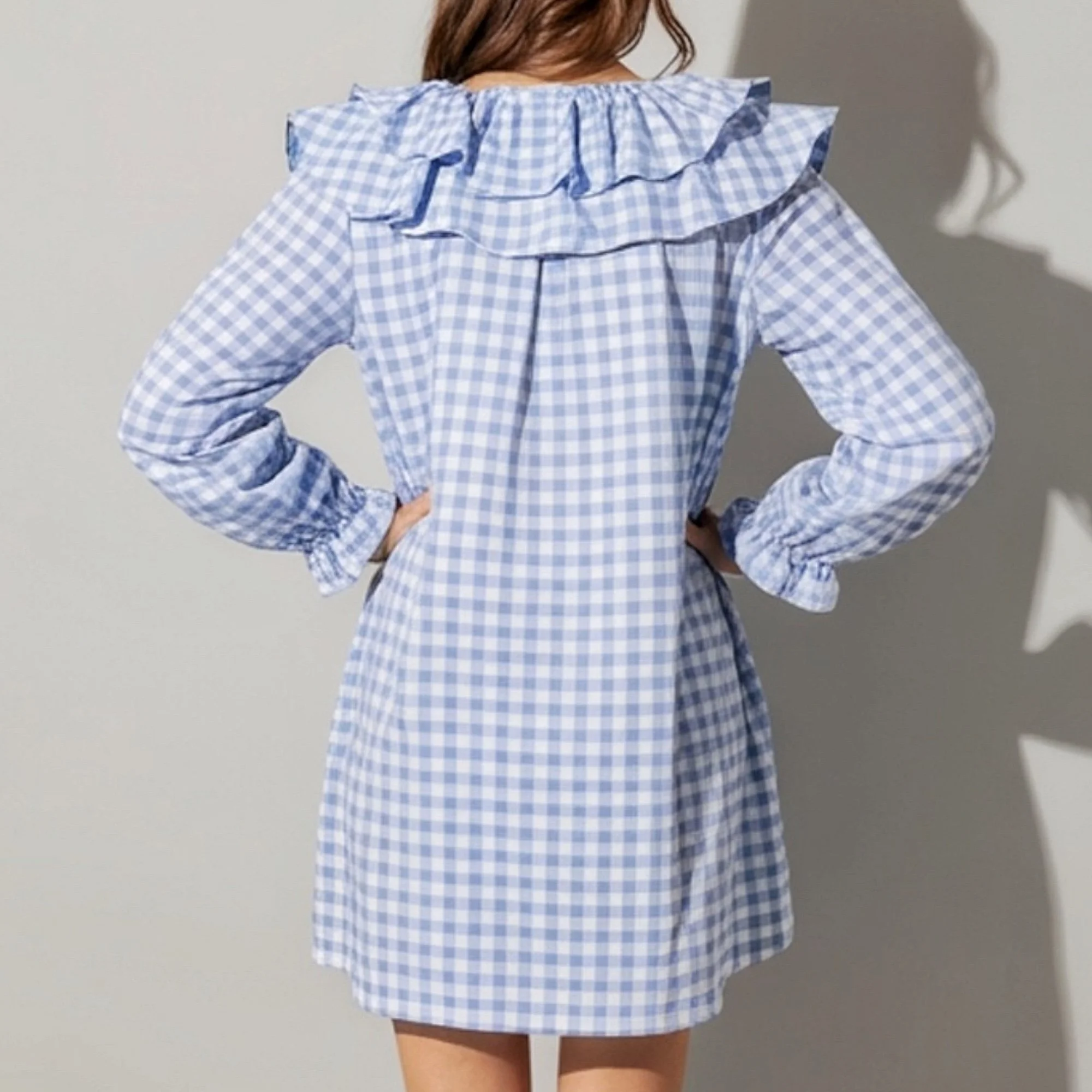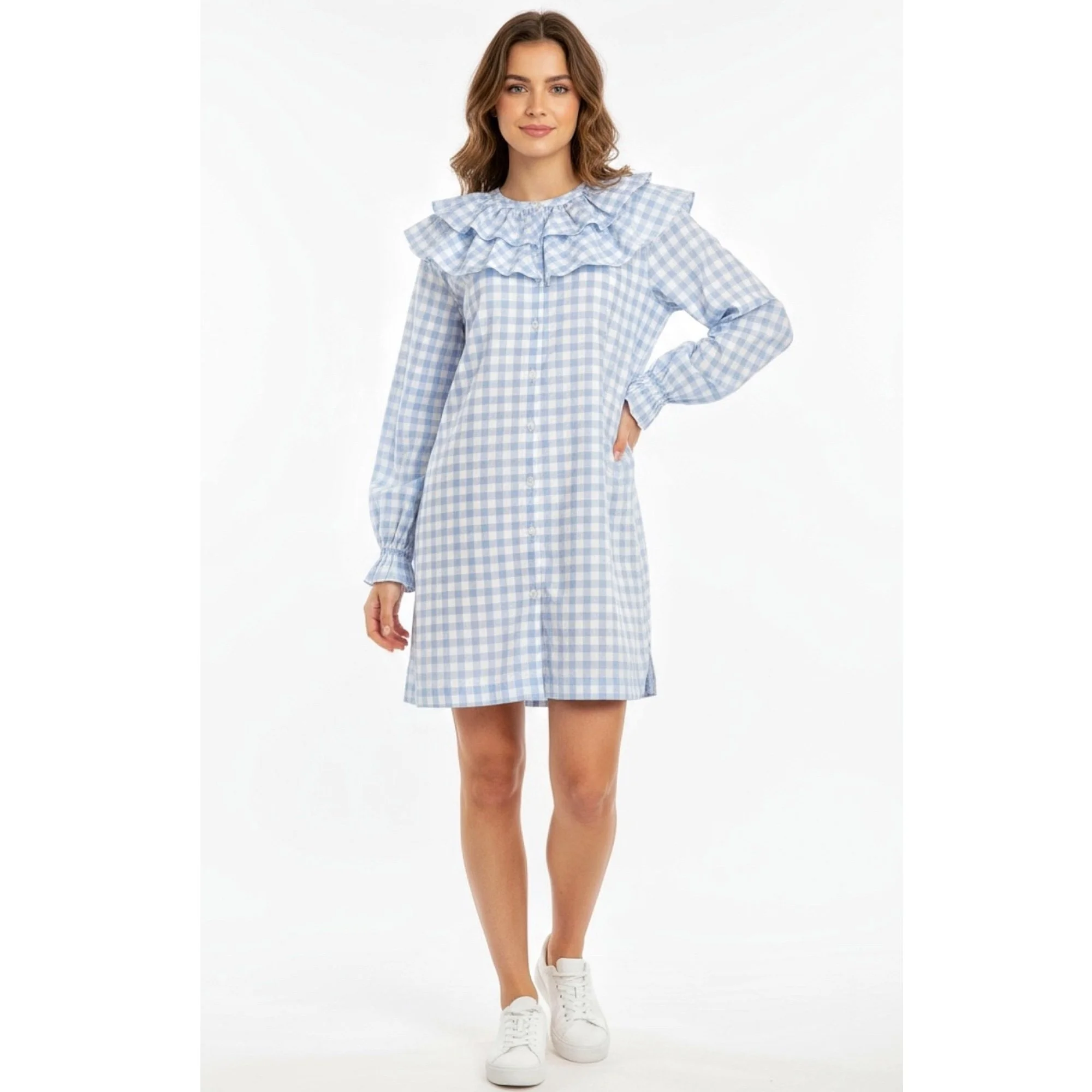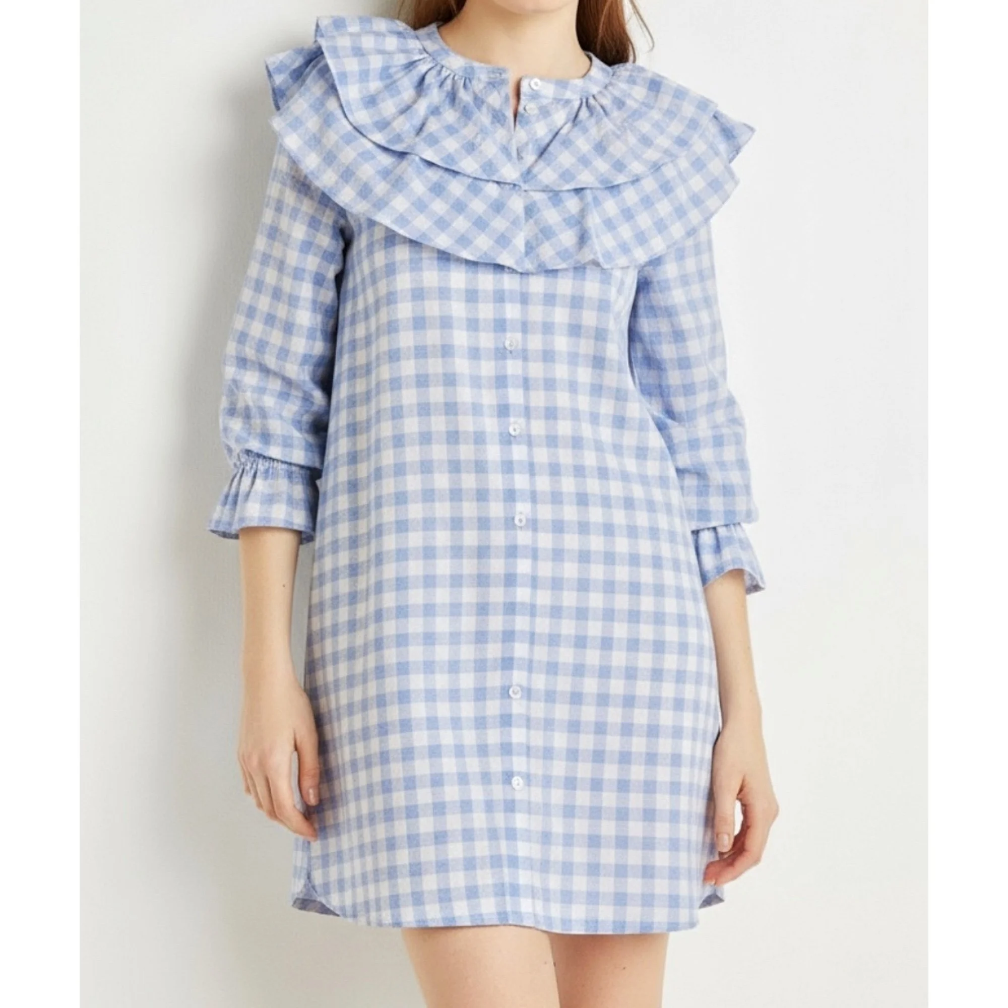 PRINT NOTE: Please look closely on our mannequin’s pictures. It doesn’t really capture on our model but actual fabric has check print with jacquard blue dots all over.